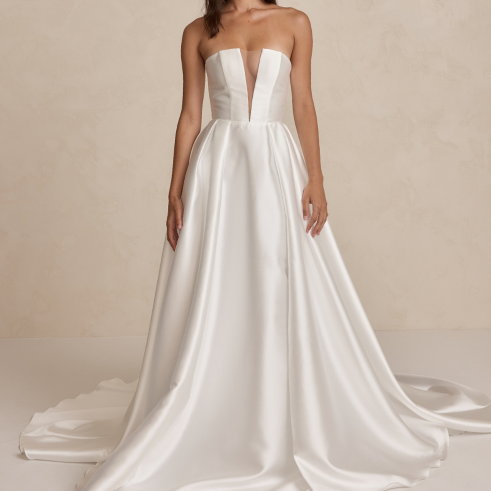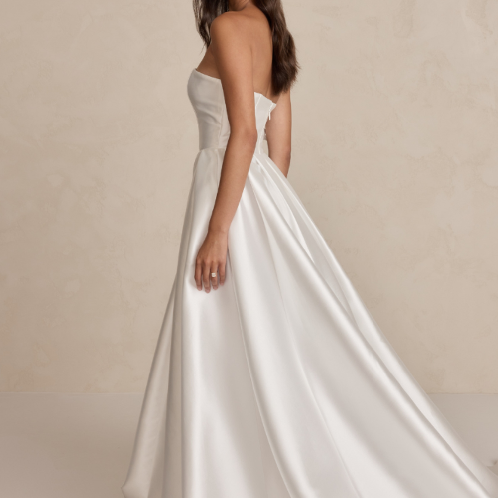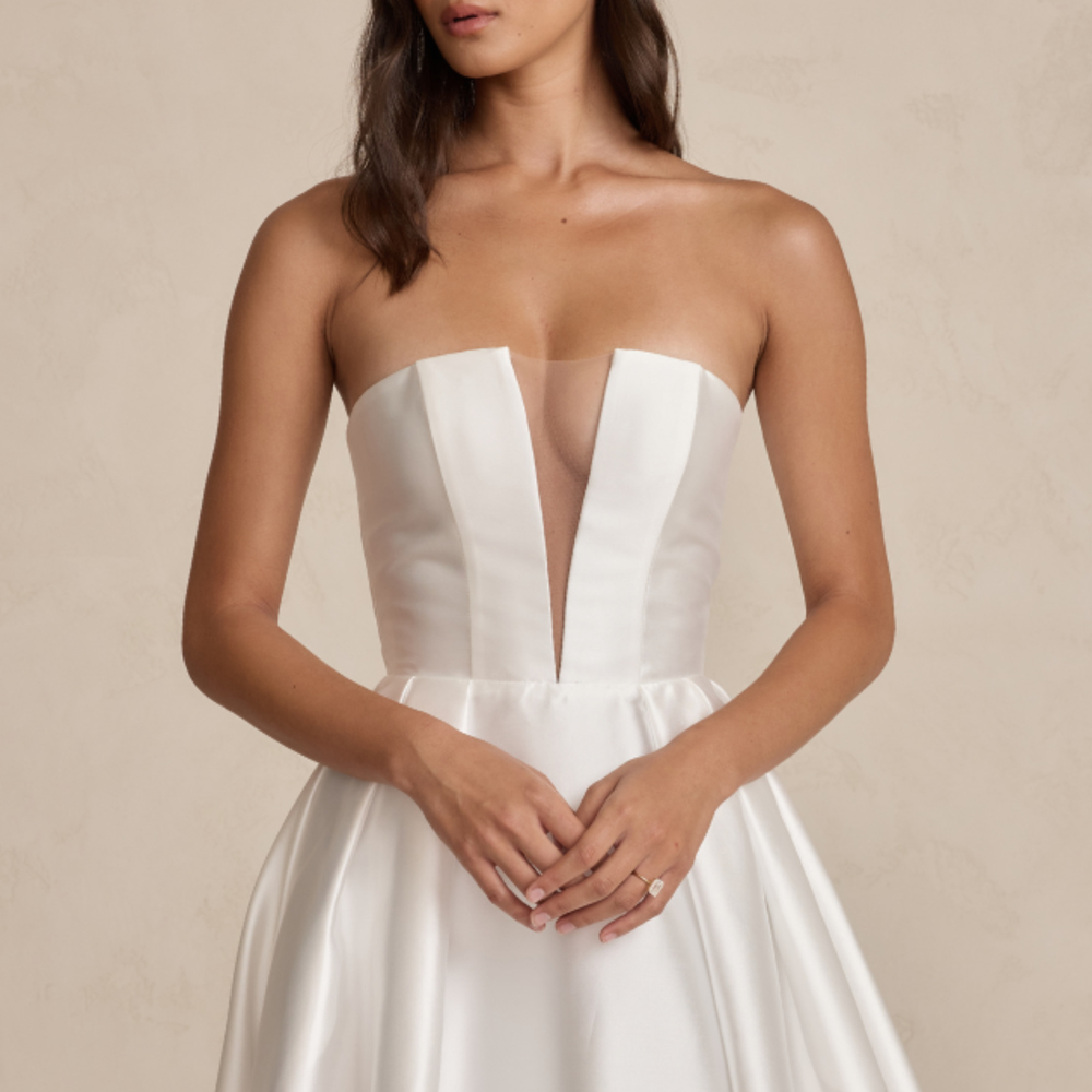 Florence features a structured bodice with MWL's iconic plunging neckline in textured Mikado fabric. Her dramatic full skirt, with a thigh-high split and hidden pockets, adds a bold touch to the timeless design, ensuring all eyes are on her.